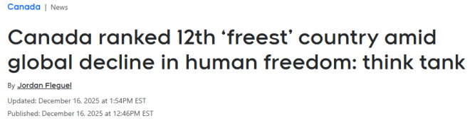 一家加拿大偏保守立场的智库根据一项全球指数,将加拿大评为全球第12个“最自由”的国家。不过,该机构同时指出,近年来全球绝大多数人口的自由程度都在下降。