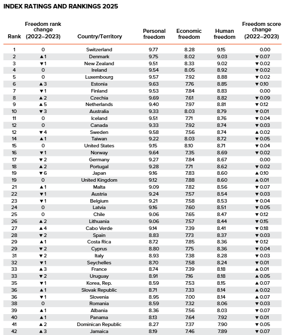 研究所介绍,这项指数通过87项指标来衡量个人在生活选择和经济决策方面的自由程度,评估范围包括法治、安全保障,以及言论、集会和宗教自由等多个方面。