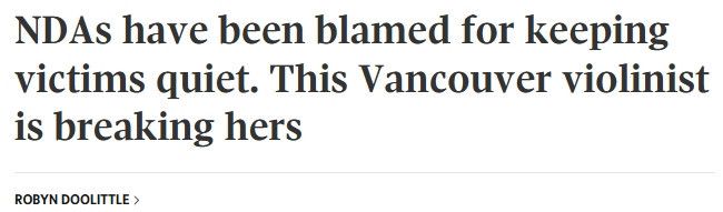 加拿大一名乐团前乐手打破保密协议,公开讲述了自己的性侵投诉、和解协议以及随后职场中的遭遇,从而引发了性侵和骚扰案件是否应使用“禁止披露协议(NDA)”这一争议的讨论。