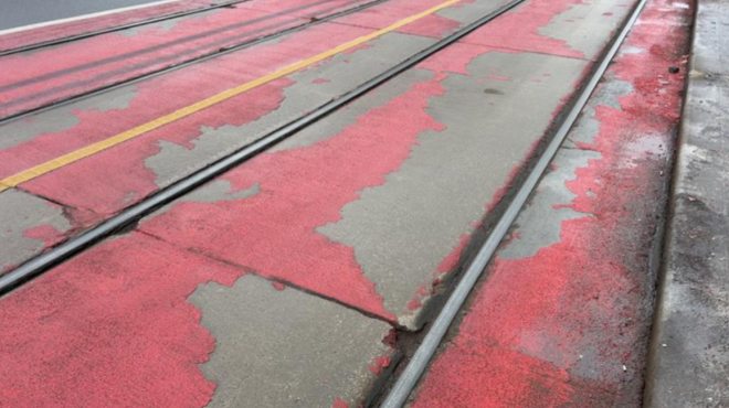 多伦多Bathurst Street公交优先车道的红色标识涂料,在施工完成一个多月后,已经开始从路面上剥落。