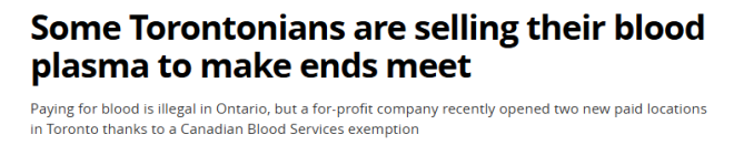 在安大略省,购买血浆是违法的。但在疫情期间血浆捐赠短缺后,加拿大血液服务机构(Canadian Blood Services, CBS)在2022年利用了该法规的豁免条款,与西班牙制药公司Grifols达成协议,允许该公司向加拿大人付费收集血浆。