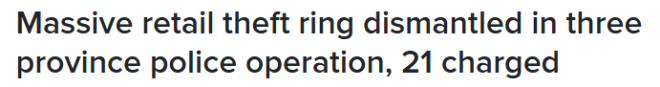 警方称,此次行动包括多次协调突袭、跨省抓捕,并查获价值超过100万加元的被盗商品。