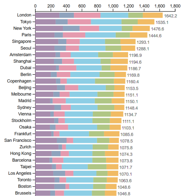伦敦以1642.2分继续稳居榜首,自2012年以来一直保持这一位置,其后依次是东京(1535.1分)和纽约(1476.6分)。