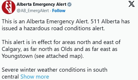 加拿大环境与气候变化部(ECCC)向卡尔加里发布了吹雪警报,并通报称阿尔伯塔省南部多条高速公路的路况危险。
