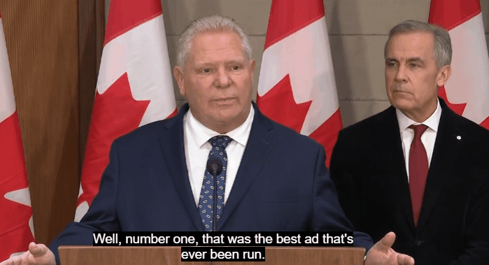 “特朗普总统第一天站出来说,‘如果我是加拿大,我也会投放这则广告,’”福特说,“但后来有‘小道消息’在他耳边低语,事情随后就变了。”