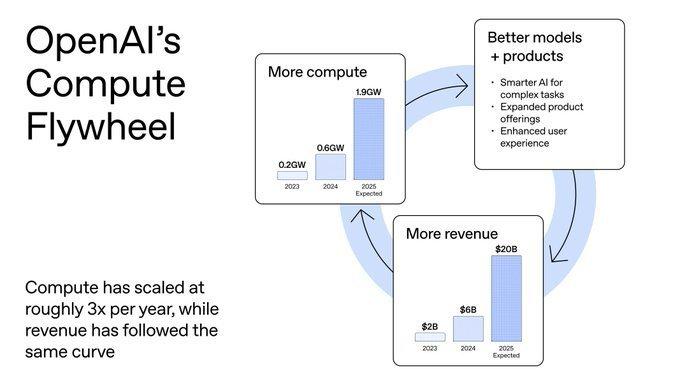 OpenAI也贴出一张名为「运算飞轮」的图表,上方写道:「运算将推动进步」。图表内容显示,更多运算将带来更好的模型和产品,进而创造更多营收,而营收又可再投入算力,形成一个循环(见附图)。