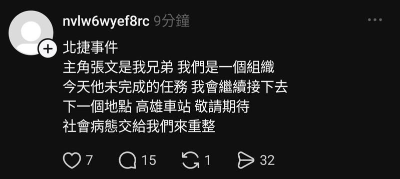 案发后,社群网络Threads有署名nvlw6wyef8rc5的网友贴文,指「北捷事件主角张文是我兄弟,我们是一个组组织,今天他未完成的任务,我会继续接下去,下一个地点高雄车站敬请期待,社会病态交给我们来重整」。