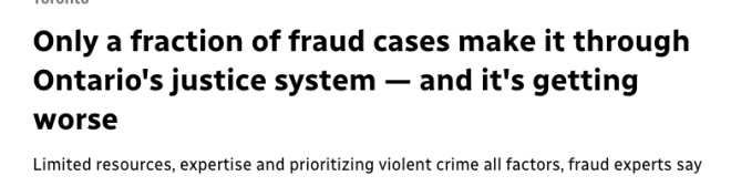 CBC在2023年推出的《诈骗的代价》系列调查报道中就曾指出,安省的诈骗案件中,仅有极少数能真正进入司法审判程序。