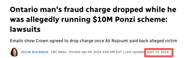 早在2024年4月,CBC就曾报道其投资诈骗行为,部分察觉异常的受害者当时已提起民事诉讼,试图追回投资。