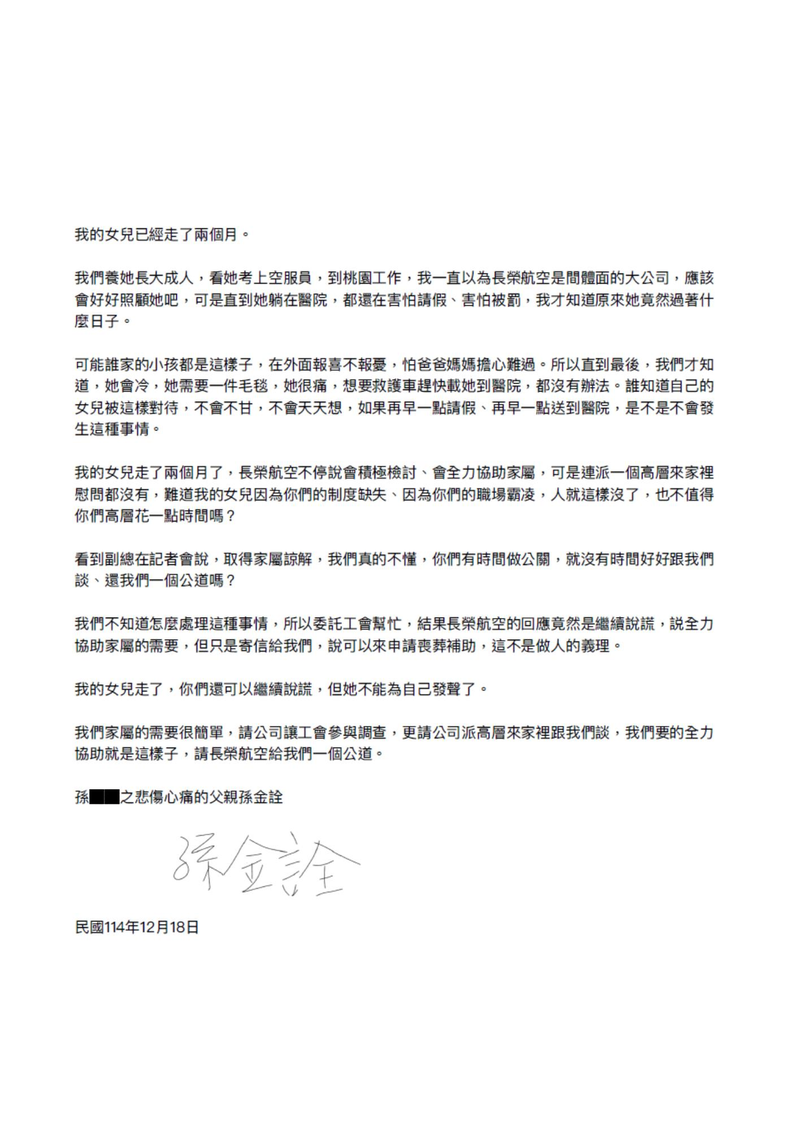 桃园市空服员职业工会日前在长荣航空公司门口召开记者会,呼吁长荣航空应开放工会参与此案职场霸凌调查,并尽快与此案家属协商赔偿事宜。工会今更代孙姓空服员的父亲发出一封公开信,家属在信中痛陈,直到女儿躺在医院,都还在害怕请假、害怕被罚,才知道原来她竟然过着什么日子。