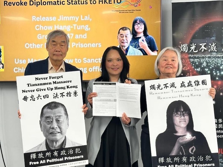 2024年九月,华裔人权组织联合发起议会签名请愿活动,释放黎智英、邹幸彤。赞助人、议员关慧贞(中),多伦多支联会(TADC)共同主席关卓中(左)、吴温温出席了记者会。