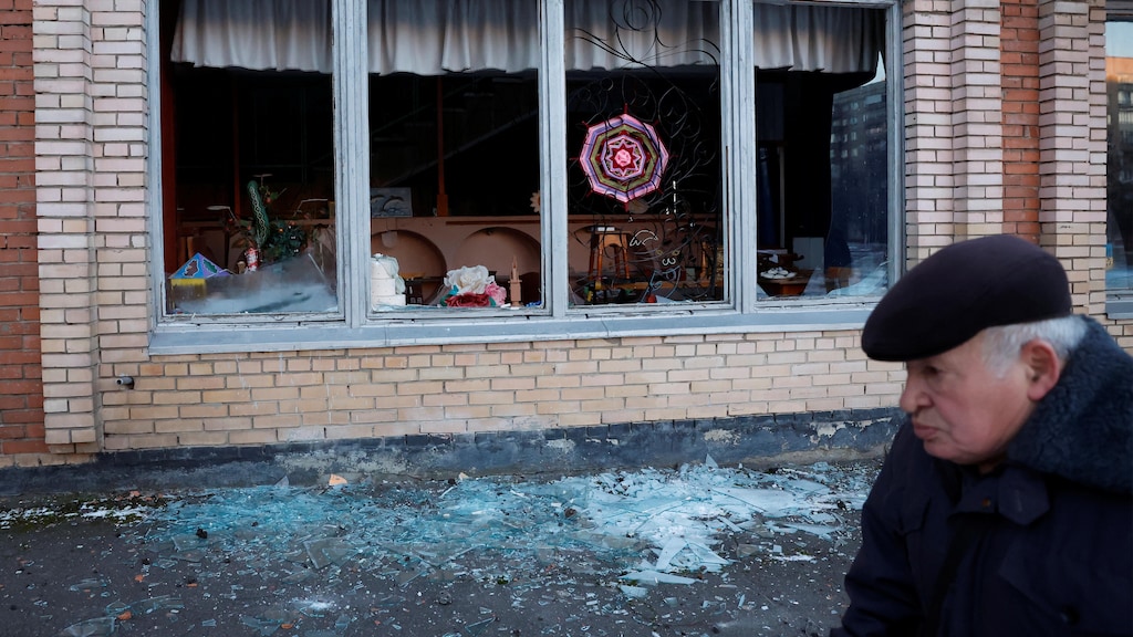 2023年1月8日,乌克兰克拉马托尔斯克(Kramatorsk),一名男子走过一栋受导弹袭击而损毁的建筑。