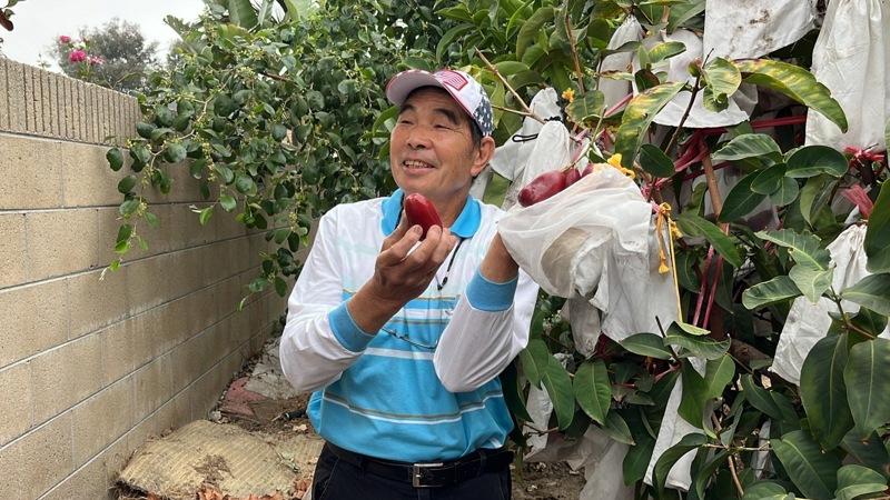 廖大盛从台湾建筑商转型为南加州农夫,种植和推广台湾特色水果,受到当地华人社区欢迎。(记者张庭瑜/摄影)