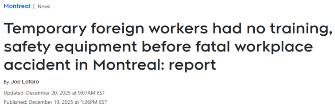 加拿大魁北克省职业健康与安全机构的一份调查报告指出,2023年在蒙特利尔一处建筑工地被倒塌墙体砸死的一名临时外籍工人,当时既没有任何个人防护装备,也没有建筑施工所需的培训、经验或资质。