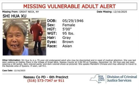 长岛大颈(Great Neck)79岁失智症妇人徐世华(Shi Hua Xu)自本周二16日下午离家后至今仍下落不明。家属表示,徐妇已失踪多日,加上近日天气寒冷且降雨不歇,令家人十分忧心,目前警方、家属及社区目前持续展开搜索。长岛北罕普斯狄镇(North Hempstead)议员刘巧怡(Christine Liu)表示,至今仍未掌握确切行踪,呼吁民众协助留意并提供线索。