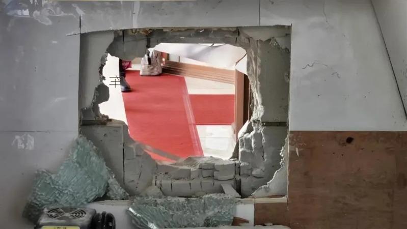 据极目新闻报导,黄陂区盘龙城一珠宝店报警称店内失窃。店员在早上上班时发现,金店大门右侧墙壁破了一个大洞,店内柜台一片狼藉,6个黄金首饰柜台已被清空。警方到场发现,金店配电箱遭人为破坏,店内监控因断电失效。大门右侧墙壁被砸出一个可容人通过的大洞,相邻手机维修店的门锁被撬。初步判断,嫌疑人应是先撬门进入手机店,再凿穿隔墙,潜入金店实施盗窃,失窃黄金约1783克。