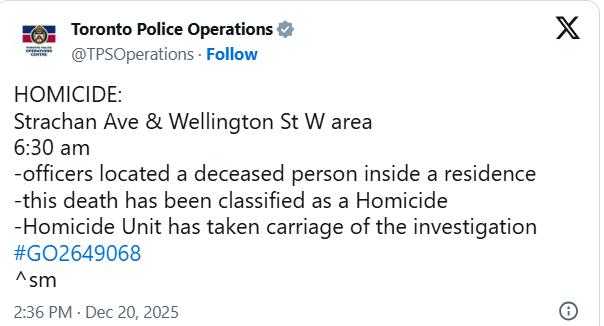 签到 欢迎!登录你的帐户 您的用户名 您的密码 Forgot your password? Get help 找回密码 恢复您的密码 您的电子邮件 密码将通过电子邮件发送给您。 多伦多警方正在调查市中心Queen West一宗凶杀案 2025年12月21日 加拿大新闻 分享 Facebook Twitter Pinterest WhatsApp 多伦多警方说,他们正在调查发生在该市Queen West的一宗凶杀案。 图源:CP24 警方在社交媒体上表示,周六上午6:30,警员在Strachan Avenue与Wellington Street West一带的一处住宅内发现一名死亡人员。 凶杀案调查组已接手调查。 警方告诉CP24,目前调查仍处于早期阶段,调查人员正在确认死者身份,并在公布更多信息前通知其近亲。 调查人员认为目前不存在对公众安全的风险。 热点 天津医院护士更衣被偷拍 还放色情网站 9分钟视频疯传 admin - 台北随机杀人案 中国国台办脸书发文:关切和痛心 admin - 年长熟客突然不来喝汤了 佛州餐厅主厨警觉上门救回1命 admin - 北捷随机杀人案蒋万安代伤者找救命恩人 就是台大父女档急诊医师 admin - 这一年「2个春节」 网友热议:能放两次假? 答案扎心 admin - 被ICE强制分离 纽约华男与6岁儿已团聚将遭遣返 admin - 前一篇文章加拿大反移民情绪升温,民意调查显示过半认为太多了下一篇文章多伦多正在出售的6套最便宜房子:价格是真低,毛病也不少 顶流!国产”老头乐”爆火加拿大!老外排队抢!居然卖这个价! - 2025年12月21日 华人老夫妇公寓被人盯上!家门被喷间谍、刻符号、门前纵火! - 2025年12月21日 加拿大反移民情绪升温,民意调查显示过半认为太多了 - 2025年12月21日 发表评论取消回复
