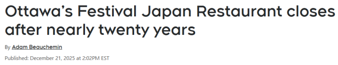 本周早些时候,Festival Japan Restaurant餐厅宣布,其最后一个营业日为12月20日(周六)。