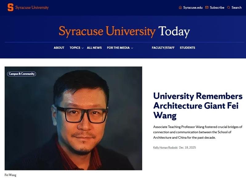 「王飞教授是我们教师团队中备受爱戴的一员,也是我的亲密挚友。」麦可.斯皮克斯日前在悼念文中写道,「他对建筑学的热忱以及对学生的无私奉献,极大地丰富了学院的内涵。」