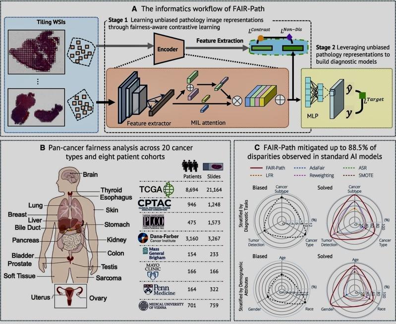 为了回应这项挑战,蒋荣先带领博士生蔡沛蓁与苏芳毅聚焦于可信任(Trustworthy)AI,进一步提出 FAIR-Path(Fairness-Aware Representation Learning for Pathology)架构,通过训练策略设计,引导模型专注于与疾病本身高度相关的病理特征,同时降低对族群相关影像线索的依赖。