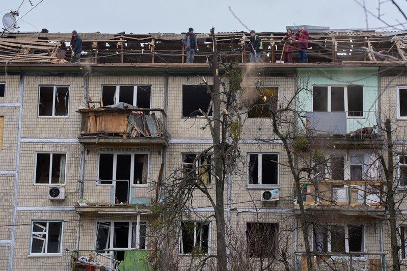 图为23日在乌克兰基辅,工人们在一栋遭受无人机攻击的公寓屋顶上清理残骸。美联社