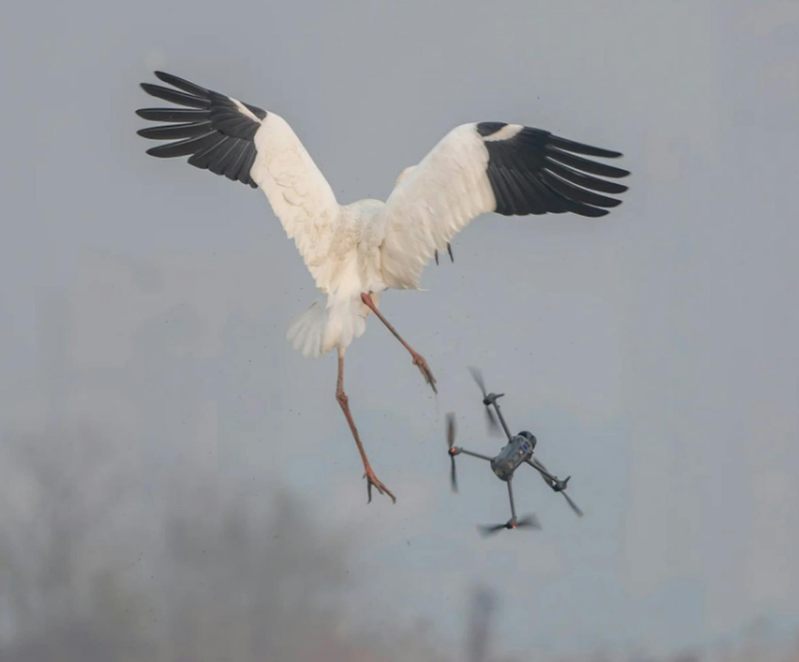 当方女士准备离开时,突然有一架无人机飞过接近白鹤,最近时只有一米距离,「几乎快要怼脸了,大白鹤被惹怒了,翅膀一拍飞起,两脚一蹬,用爪子踢无人机」。方女士称,「大家可以想像一下,如果无人机在你头顶一米的位置飞来飞去,你会不会开心?」。