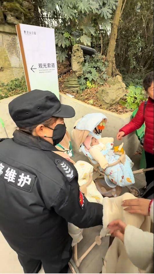 「中国的治安已经好到可以让外国友人放心到把娃『寄存』自己去坐缆车的程度,还好我这个过路的中国人也很争气,带娃换粑粑也是不带犹豫的,给自己点个赞。」同在贵阳黔灵山公园游玩的欧阳女士在社交平台发布视频时配文写道,视频中,两名婴儿分别躺在两辆婴儿车上,双眼皮大眼睛炯炯有神,其中一个婴儿大哭不止,不少游客围观哄娃。