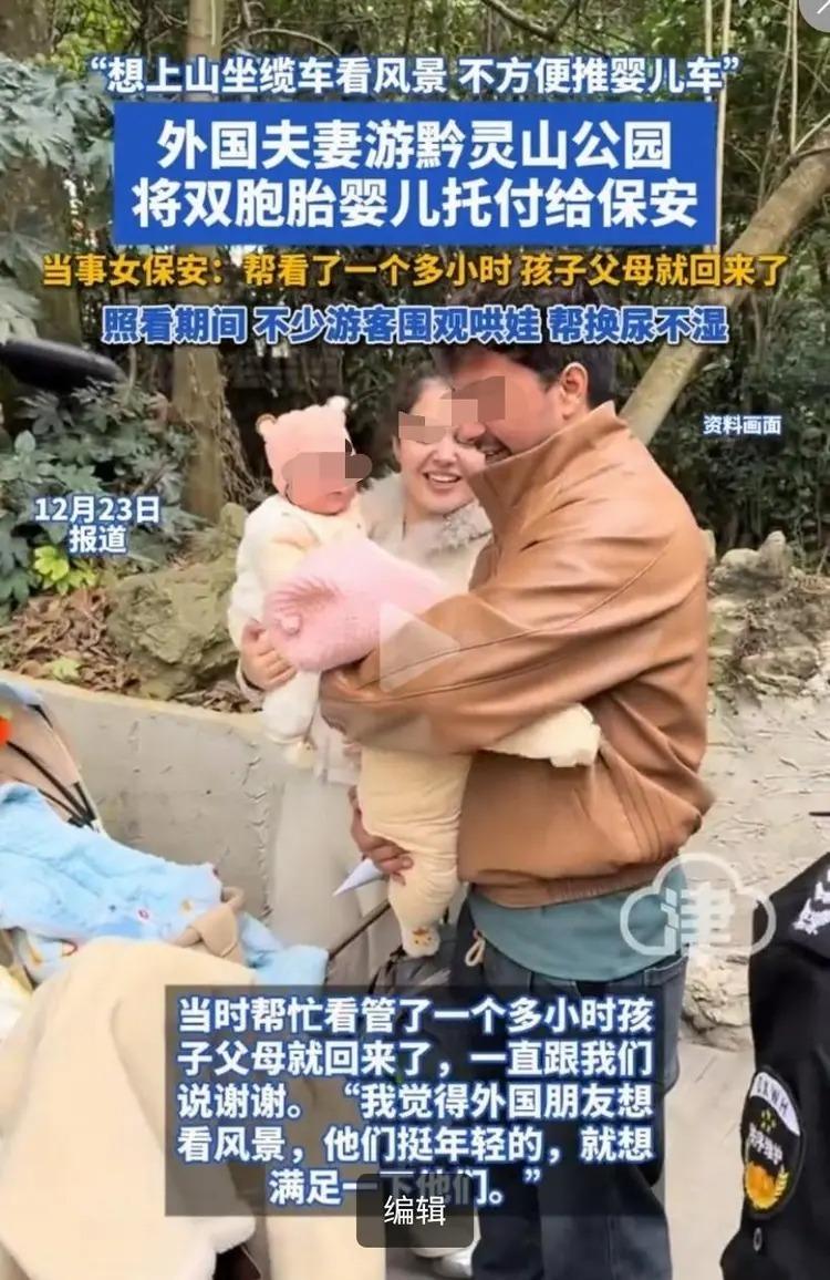 一对外国夫妻日前在贵阳黔灵山公园游玩,坐缆车时将一对双胞胎婴儿托付给公园保安看管,不少游客围观哄娃。消息传出引发热议,「中国的治安好到让外国友人放心『寄存』娃」?网友吵翻天,有人大赞暖心,有人认为「这在国外可是违法的」、「出了问题谁负责」。