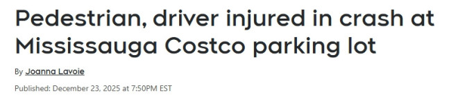 周二,密西沙加一家Costco停车场内发生交通事故,一名行人和一名司机被送往医院接受治疗。