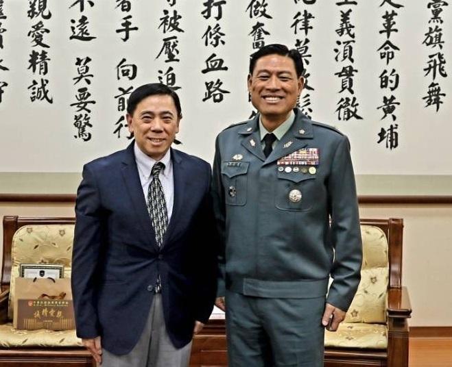 关于谭芳荣配戴的各式章记,官员解释,谭芳荣早年曾留学洪都拉斯、危地马拉等国军校,也曾担任驻危地马拉武官,是国军少数西语系将领;领口的金叶章便是危地马拉国防部长赠送的该国「荣誉少将」桂冠领章(一束桂冠叶为少将、两束为中将)。