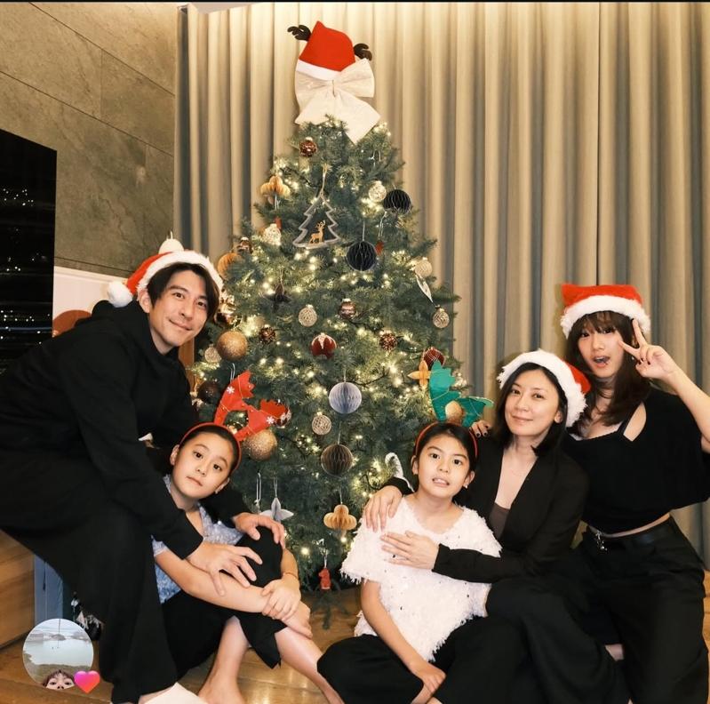 照片中修杰楷、贾静雯、梧桐妹同样戴着圣诞帽,贾静雯的妆容极淡,咘咘和波妞着带着鹿角发箍,一家人坐在圣诞树底下,记录特别的日子,梧桐妹特别出声祝福:「圣诞节快乐呀!」