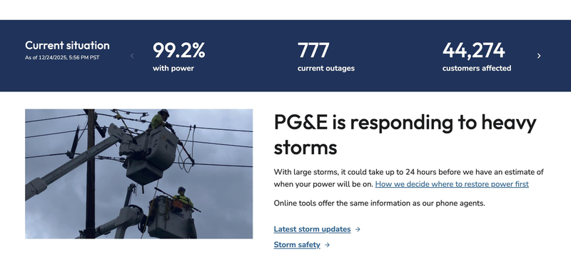 PG&E同时警告,第二波风暴预计于周三晚间至周四清晨抵达,恐再带来强阵风与中到大雨,已提前全面启动紧急应变机制。公司动员超过5500名第一线员工与承包商待命,并事先部署电线杆、电缆、变压器等关键设备,以加速停电后的修复作业。
