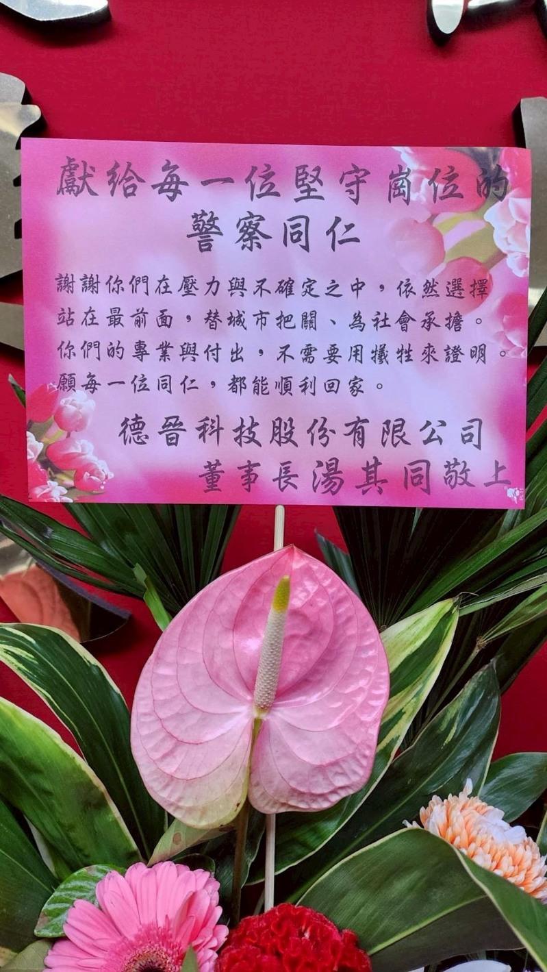 警方收到的小卡内容,包括「有您真好」、「谢谢在混乱中维护秩序的您,辛苦了」,「这几天在路上和捷运站经常能看到你们的身影,让我们安心了不少」、「你们是勇敢,令人尊敬的人」、「请多照顾好自己」、「因为有您使我们安心了许多」、「谢谢你们站岗保护人民,辛苦了」;花篮小卡则留言「谢谢你们在压力与不确定之中,依然选择站在最前面,替城市把关,为社会承担,你们的专业与付出,不需要用牺牲来证明,愿每一位同仁,都能顺利回家」,十分动容。