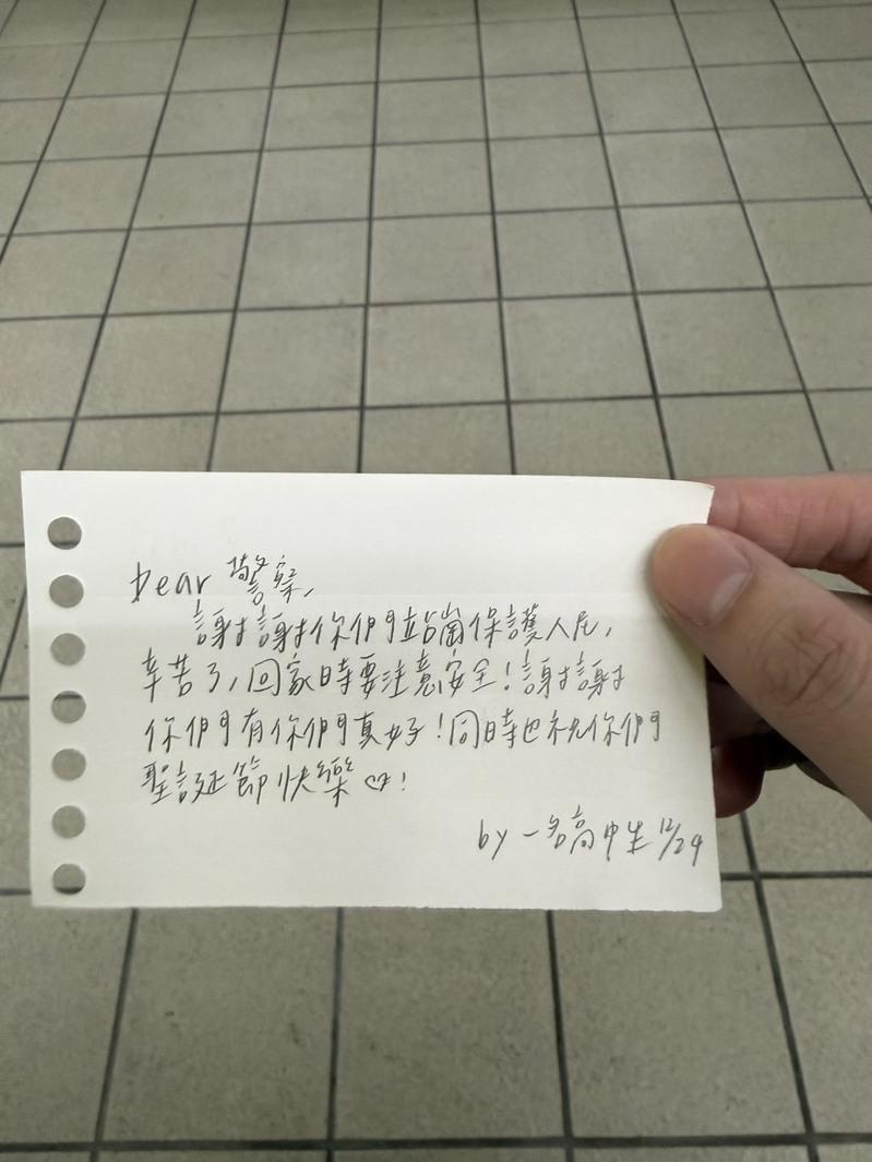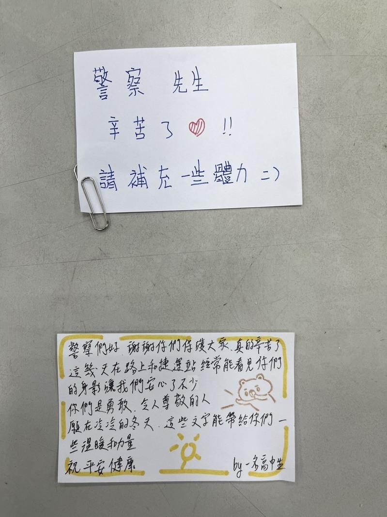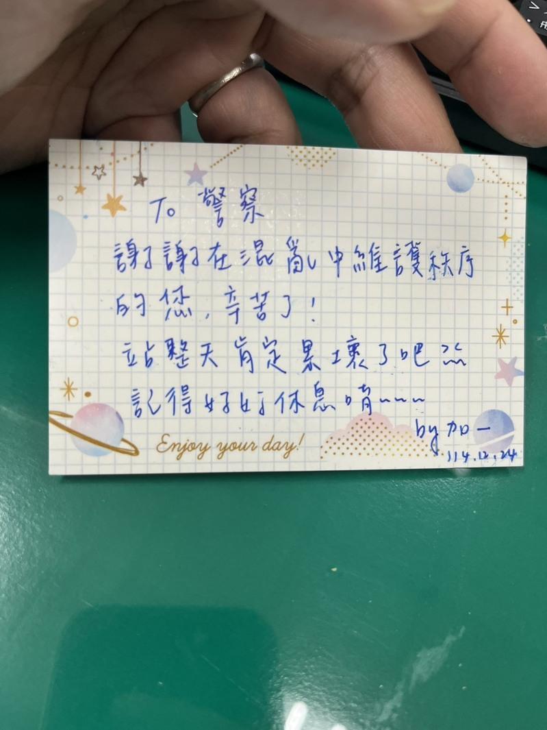 中正第一警分局表示,警察工作繁重,有时又夹带了风险,全年无休守护市民安全,而民众的一句理解、一份支持,往往就是撑过辛劳的重要力量,这些手写卡片,不只是感谢,更是彼此之间最温柔的链接,让平安夜多了一层深刻的意义。