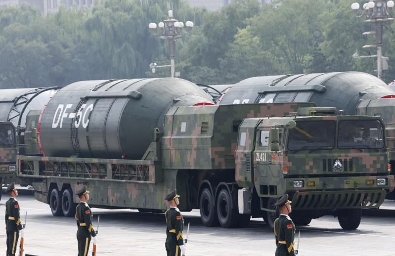 国防部发布的年度评估,称中国为「蛮力」威胁台湾研发选项。图为北京9月阅兵时展示核导弹。(新华社)