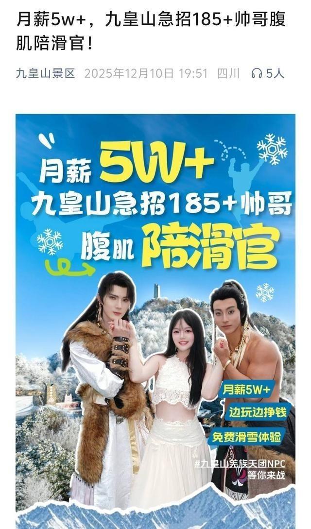 四川绵阳九皇山景区近日一则「急招185+帅哥腹肌陪滑官,月薪5万(人民币,下同)起跳」的招聘信息,在社交平台迅速走红。不少网友调侃「第一次见这么直白的招聘」,也有人自嘲「既没有185也没有腹肌」。