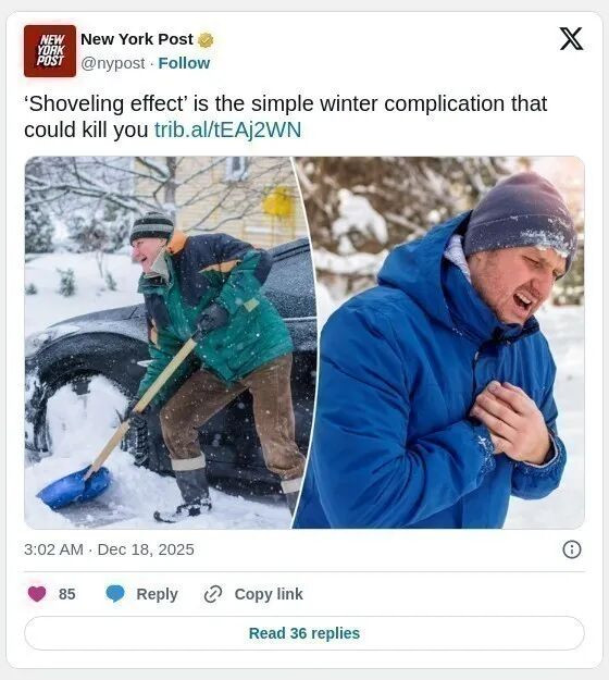 AHA建议,必须铲雪的人应采取安全措施:动作缓慢、定期休息、尽量推雪而非擡起投掷,避免一次搬动过多积雪。同时,注意心脏不适信号,如胸痛、胸闷、头晕、心悸或心律异常,出现症状应立即停止活动,如症状持续,应拨打911求助。