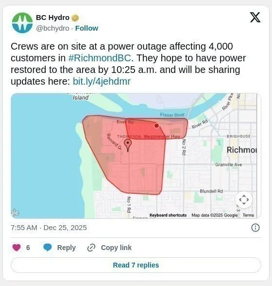 BC Hydro表示,列治文的一起停电影响了4千多名客户。接近上午8点的时候,该机构表示,工作人员已经在现场抢修。