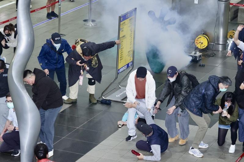 北捷今天强化危安联合演练分三阶段实施,第一阶段演练多名歹徒在市府站月台攻击聚集的人潮,抛出汽油、烟雾弹、无差别攻击,市府同步发送细胞短信引导附近区域民众避难;二阶段由多名歹徒在市府转运站,以刀械攻击排队购票人潮,演练警方到场制服歹徒、消防队后送伤患。