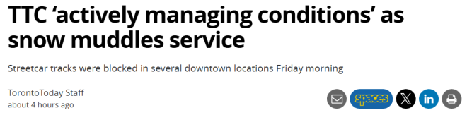 多伦多公交局(TTC)表示,他们正在“积极应对并管理当前路况和运营状况”。