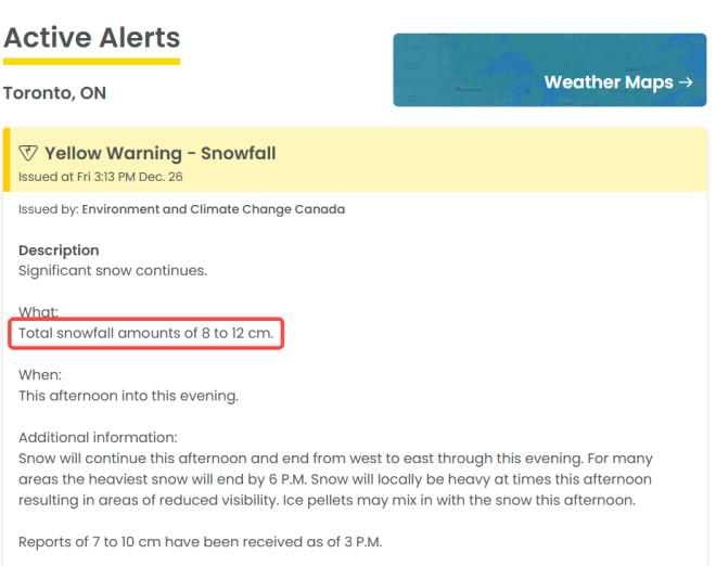 多伦多今天降雪量预计达到8至12厘米。降雪将于周五上午稍晚开始,并持续至晚间。截至下午3点,已有地区报告降雪量达到7至10厘米。