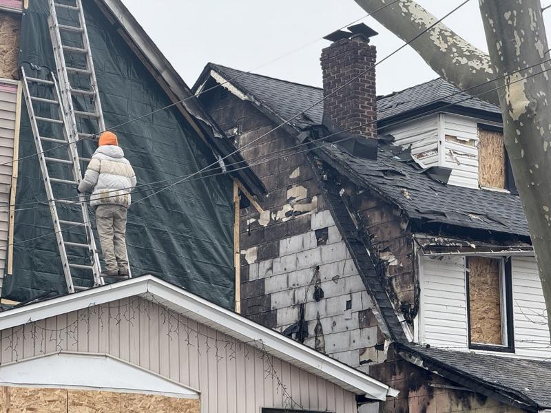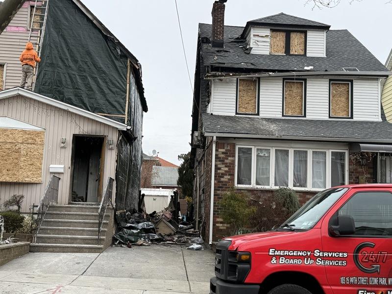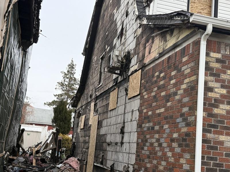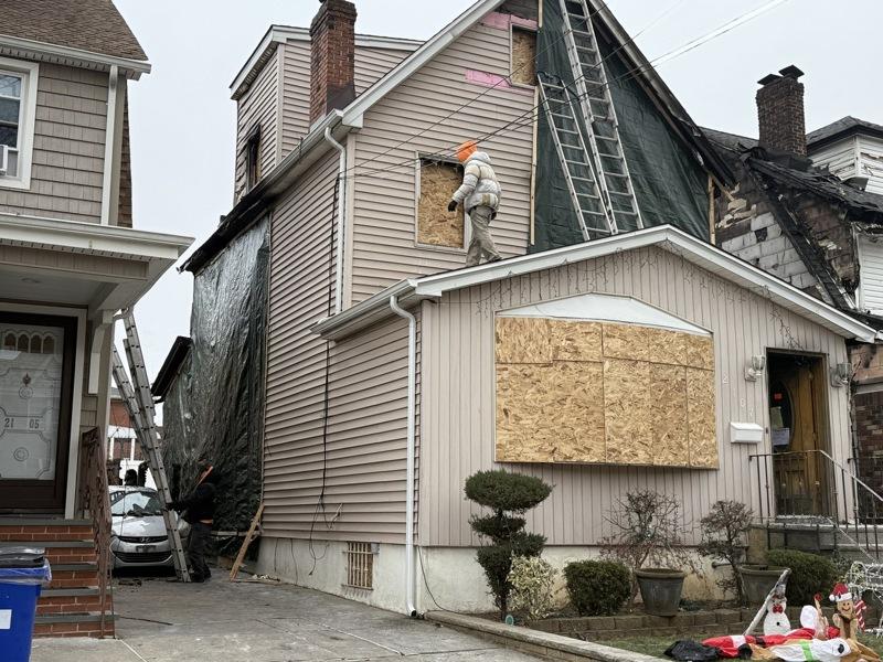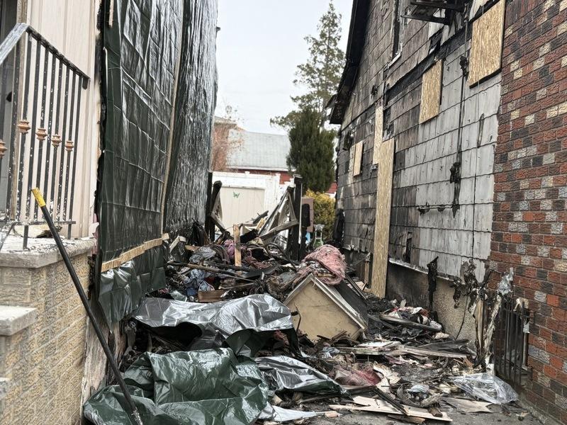 26日上午现场可见,主要起火的房屋位于147街21-07号。该栋住宅外部已由工人加装木板与遮挡帘进行临时封闭,同时大门敞开,可见屋内几乎只剩焦黑残骸。走近时,仍能闻到浓重的烧焦味。且房屋侧面堆满尚未清运的废墟,包括烧焦木料、残破家具与各类杂物。