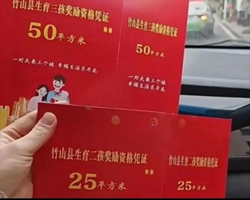 第一财经日报报导,早在2024年,竹山县政府官网就发布「购房补贴、生育奖补…黄金十条助力竹山城镇化发展!」的文档,其中在鼓励生育措施一项中提到,2021年6月1日至2026年6月1日期间生育的二孩、三孩家庭,从发文之日(2023年11月9日)起至2024年12月31日期间,在竹山县城区指定楼盘购买新建商品住房的,生育二孩购房奖补25平方公尺,生育三孩购房奖补50平方公尺,可叠加计算。