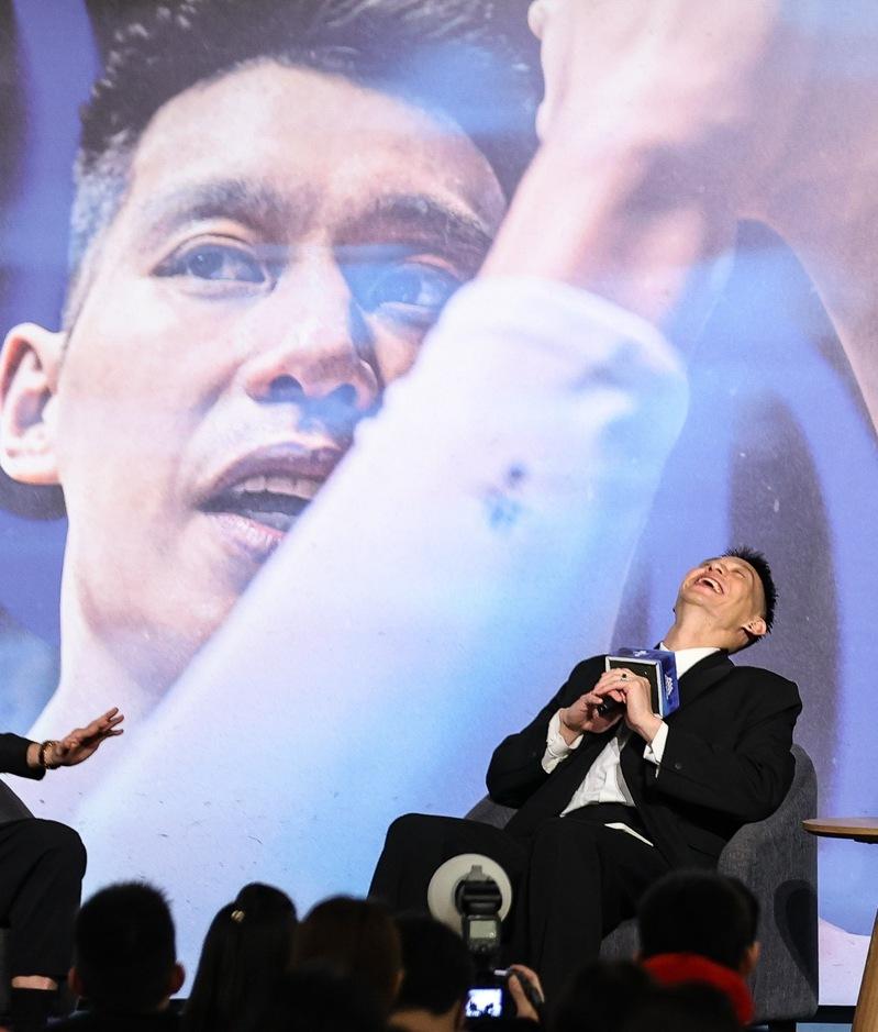 林书豪沉默时,台下有粉丝喊「再三个」,让台上的林书豪、主持人唐志中嘴角都失守,林书豪也立刻给了回应表示这数字很难达成,让现场再响起一阵笑声。