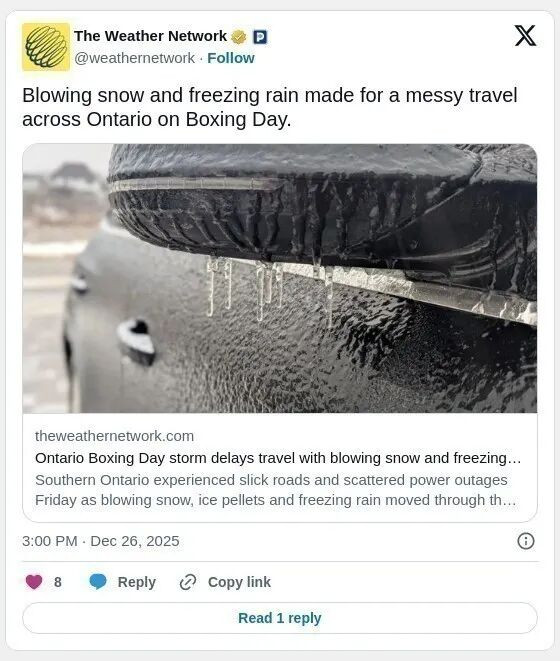 在安省,一股迅速增强的低压系统正横扫五大湖地区,预计将带来持续时间较长的冻雨天气。冻雨将于周六深夜开始,持续至周日下午,并可能延续到周一早晨。多伦多以北地区,包括纽马克特(Newmarket)、奥罗拉(Aurora)、乔治娜(Georgina)、厄克斯布里奇(Uxbridge)以及约克区北部部分地区,预计将出现5至10毫米的积冰。多伦多以东的科堡(Cobourg)和科尔本(Colborne)等社区也被纳入警示范围。
