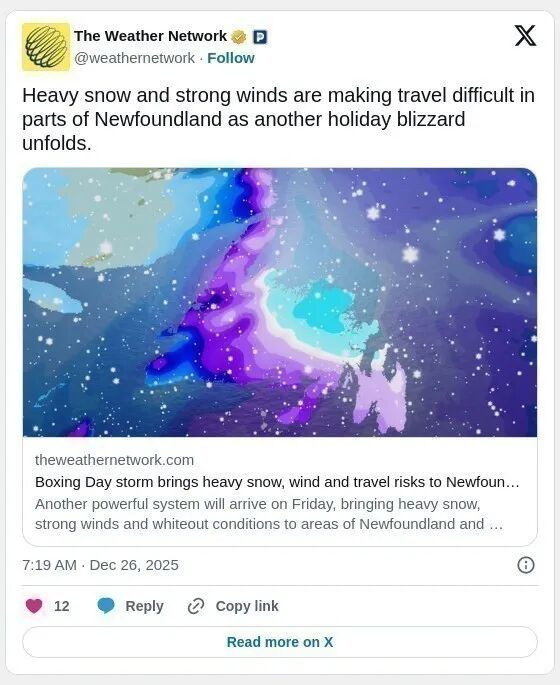 在加拿大东部,纽芬兰与拉布拉多省的绿湾(Green Bay)和白湾(White Bay)正遭受一场强烈冬季风暴侵袭。预计将降下40至60厘米的湿重降雪,阵风风速可达每小时110公里,恶劣天气可能持续至周日清晨,出行条件极为危险。