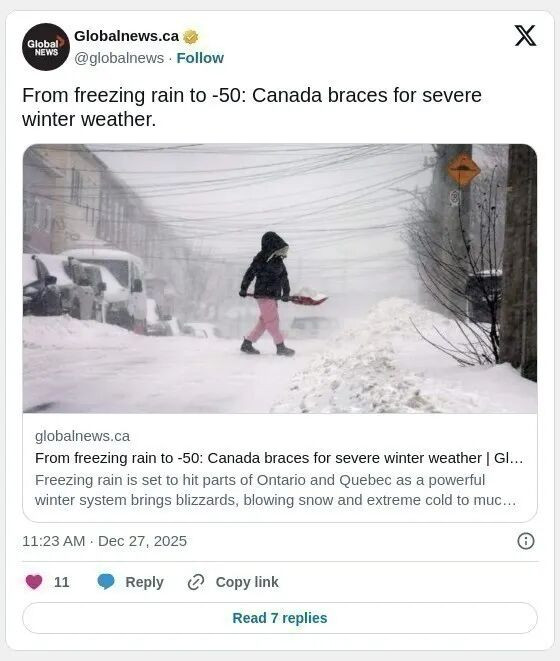 加拿大环境部提醒,天气形势可能迅速变化,建议公众持续关注最新天气预报和警报信息,以应对这场横跨全国的冬季天气系统。