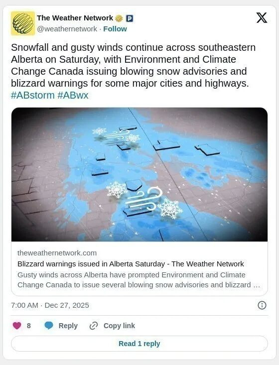 草原省份方面,阿尔伯塔省和萨斯喀彻温省多地发布吹雪和能见度低的天气预警,部分地区甚至已升级为暴风雪警报,驾驶条件十分危险。