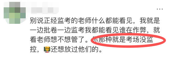 这条吐槽底下,有网友秒懂:“别说正经监考的老师了,我一边批卷一边监考都能看见谁在作弊,就看老师想不想管。你那考场明显是没严控,还想放过他们的。”
