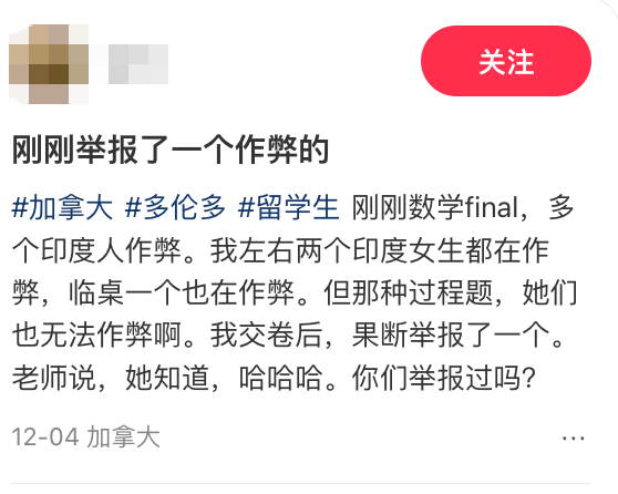 比如,一则贴文吐槽,在数学期末考试过程中,考场里好几个印度人在作弊,左右两个印度女生一直在搞小动作,临桌那位也没闲着。